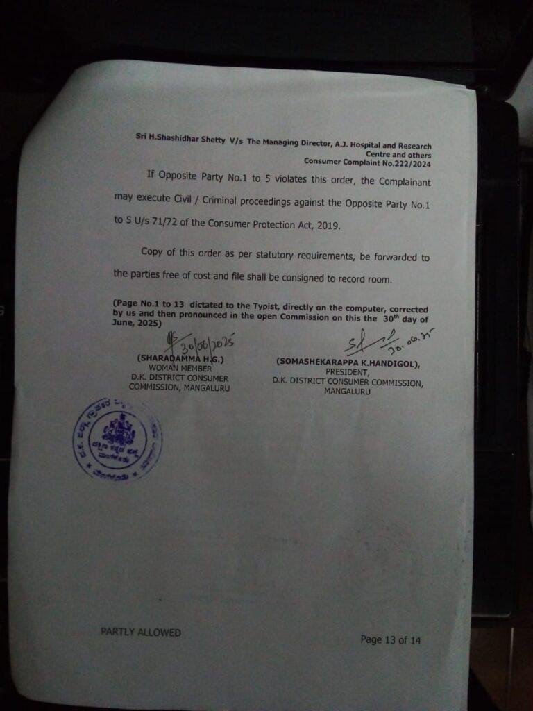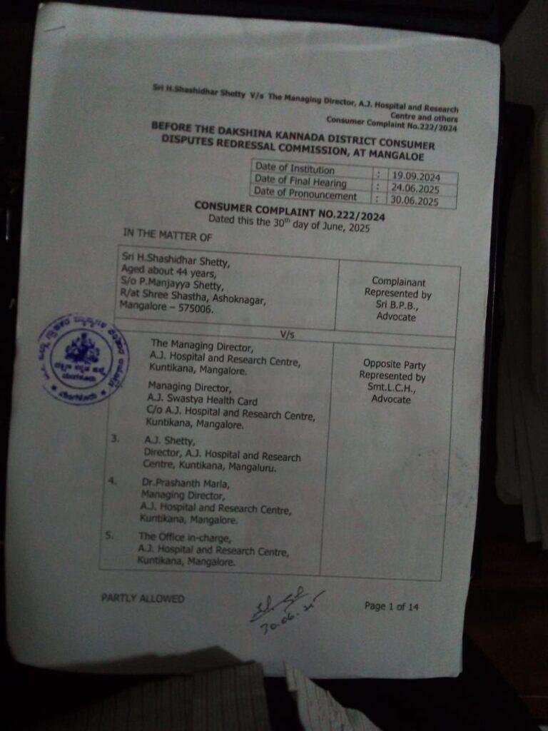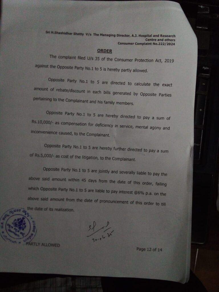 ಎಂದು ದಕ್ಷಿಣ ಕನ್ನಡ ಜಿಲ್ಲಾ ಗ್ರಾಹಕರ ವ್ಯಾಜ್ಯಗಳ ಪರಿಹಾರ ಆಯೋಗ ಆದೇಶಿಸಿದೆ ದೂರುದಾರ ಶಶಿಧರ್ ಶೆಟ್ಟಿ ಪರವಾಗಿ ಎಜೆ ಆಸ್ಪತ್ರೆ ವಿರುದ್ಧವಾಗಿ ನ್ಯಾಯವಾದಿ ಬಿಪಿ ಭಟ್ ವಾದ ಮಂಡಿಸಿದ್ದರು