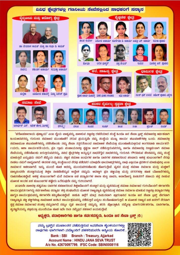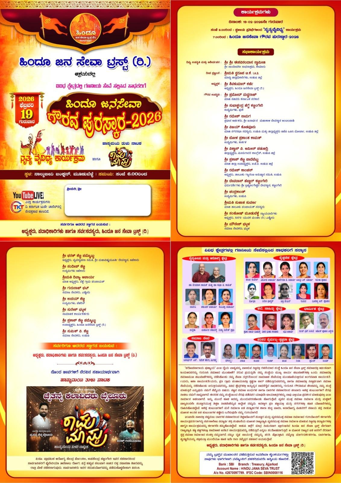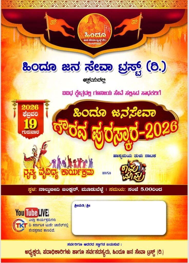 ಹಿಂದೂ ಜನಸೇವಾ ಟ್ರಸ್ಟ್ (ರಿ) ವತಿಯಿಂದ ಪ್ರತಿ ವರ್ಷ ನಡೆಯುವ ಸಮಾಜದಲ್ಲಿ ಸಮಾಜಮುಖಿ ಚಟುವಟಿಕೆ ನಡೆಸಿಕೊಂಡು ಸ್ವಸ್ಥ ಸಮಾಜ ನಿರ್ಮಾಣಕ್ಕೆ ಕಾರಣೀಕರ್ತರಾಗಿರುವ ಸಮಾಜದ ಗಣ್ಯ ವ್ಯಕ್ತಿಗಳನ್ನ ಗುರುತಿಸಿ ಗೌರವಿಸುವ ಹಿಂದೂ ಜನ ಸೇವಾ ಗೌರವ ಪುರಸ್ಕಾರ 2026 ಈ ಬಾರಿ ದಿನಾಂಕ19/2/2026ನೇ ಗುರುವಾರ ಸಂಜೆ 6ರಿಂದ ಮೂಡುಬೆಳ್ಳೆ ನಾಲ್ಕು ಬೀದಿ ಜಂಕ್ಷನ್ ನಲ್ಲಿ ನಡೆಯಲಿದೆ