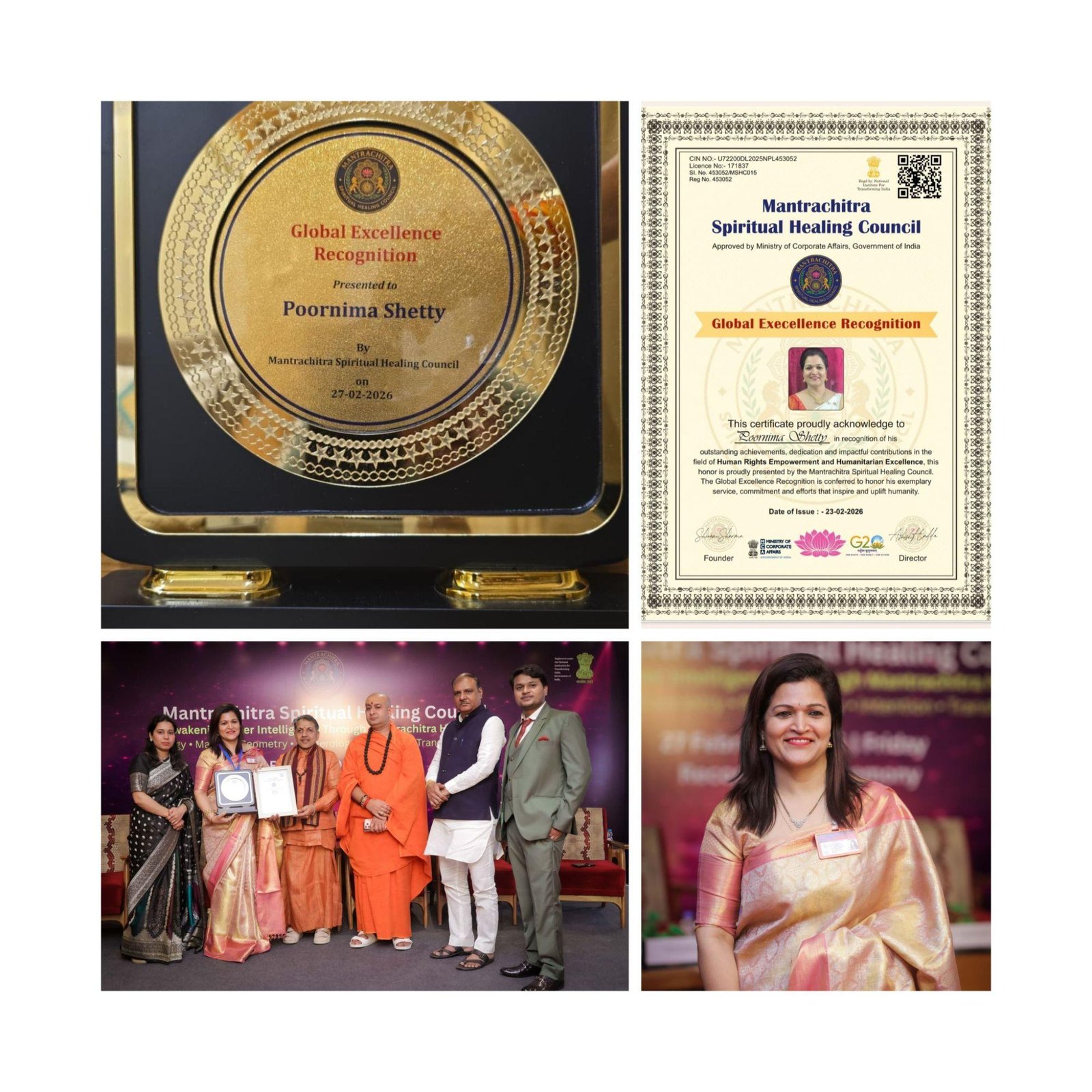 ಸಾಮಾಜಿಕ ಸೇವಾ ಕಾರ್ಯಕರ್ತೆ ಹಾಗೂ ‘ವಸುದೈವ ಕುಟುಂಬಕಂ’ ಎನ್ಜಿಒ ಸಂಸ್ಥೆಯ ಸಂಸ್ಥಾಪಕಿ ಪೂರ್ಣಿಮಾ ಶೆಟ್ಟಿ ಅವರಿಗೆ ಭಾರತ ಸರ್ಕಾರದ ಕಾರ್ಪೊರೇಟ್ ವ್ಯವಹಾರಗಳ ಸಚಿವಾಲಯವು ಅನುಮೋದಿಸಿದ ಮಂತ್ರಚಿತ್ರ ಆಧ್ಯಾತ್ಮಿಕ ಚಿಕಿತ್ಸೆ ಮಂಡಳಿಯಿಂದ ಪ್ರತಿಷ್ಠಿತ ‘ಮಾನವ ಹಕ್ಕುಗಳ ಸಬಲೀಕರಣ ಮತ್ತು ಮಾನವೀಯ ಶ್ರೇಷ್ಠತೆ’ ಪ್ರಶಸ್ತಿಯನ್ನು ನೀಡಿ ಗೌರವಿಸಲಾಗಿದೆ.