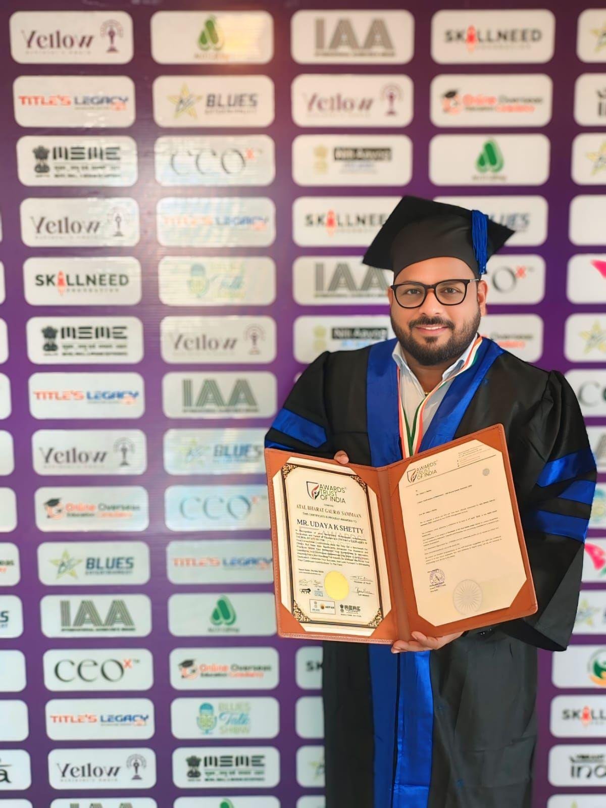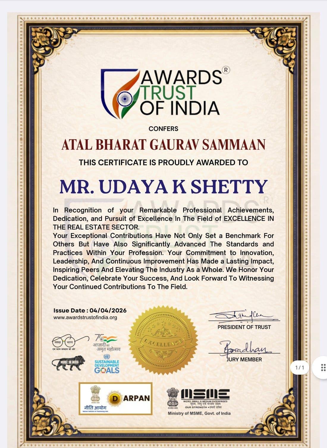 ಅಟಲ್ ಭಾರತ್ ಗೌರವ ಸಮ್ಮಾನ್ – ಇದು ಭಾರತದ ಶ್ರೇಷ್ಠ ರಾಷ್ಟ್ರೀಯ ಗೌರವಗಳಲ್ಲಿ ಒಂದು! ಅವಾರ್ಡ್ಸ್ ಟ್ರಸ್ಟ್ ಆಫ್ ಇಂಡಿಯಾ ಈ ಪ್ರಶಸ್ತಿಯನ್ನು ನೀಡಿ ತುಳುನಾಡು ಪ್ರಾಪರ್ಟೀಸ್ನ ಪ್ರಾಮಾಣಿಕ ಕೆಲಸ, ರಿಯಲ್ ಎಸ್ಟೇಟ್ ಕ್ಷೇತ್ರದಲ್ಲಿ ಮಾಡಿದ ಉತ್ತಮ ಸಾಧನೆಗಳನ್ನು, ನಾಯಕತ್ವವನ್ನು, ಹೊಸ ಮಾನದಂಡಗಳನ್ನು ಹೊಂದಿಸಿ ಉದ್ಯಮವನ್ನು ಎತ್ತರಕ್ಕೆ ಬೆಳೆಸಿದ್ದನ್ನು ಗುರುತಿಸಿ. ತುಳುನಾಡು ಪ್ರಾಪರ್ಟೀಸ್ ಮಾಲೀಕ ಉದಯ ಕೆ. ಶೆಟ್ಟಿ ಅವರಿಗೆ ಗೋವಾದಲ್ಲಿ ನಡೆದ ಕಾರ್ಯಕ್ರಮದಲ್ಲಿ ಪ್ರಶಸ್ತಿ ನೀಡಿ ಗೌರವಿಸಲಾಗಿದೆ